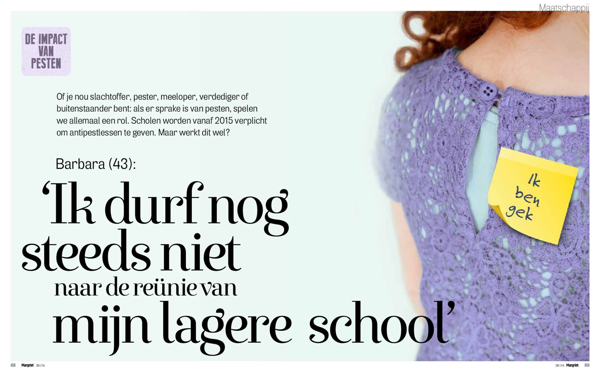 In mijn stuk voor Margriet komen niet alleen slachtoffers van pesten aan het woord, maar maakt ook een pester van haar hart geen moordkuil. Heeft ze zoveel jaren later eigenlijk spijt?